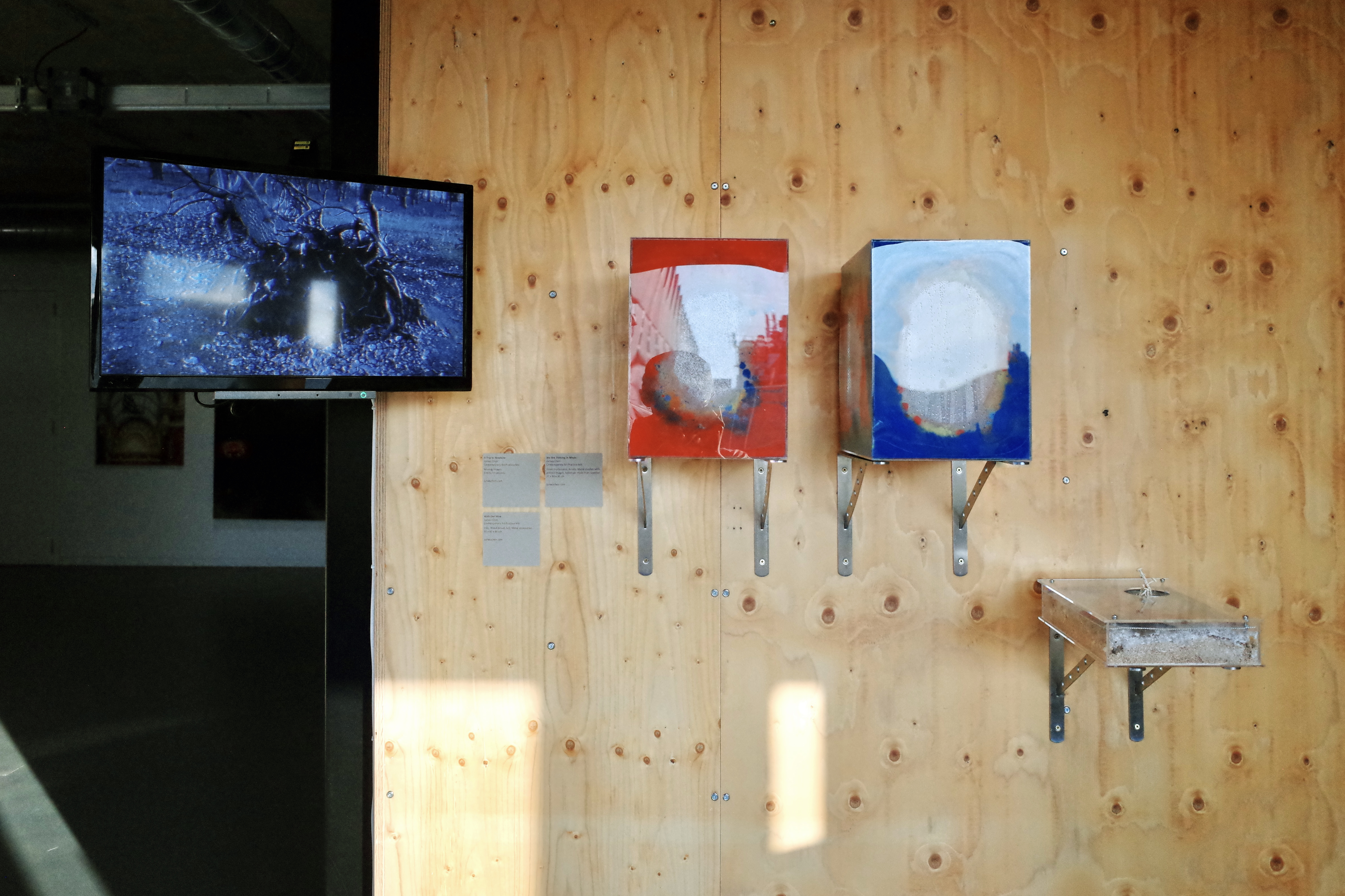 Freash mushrooms and mycelium, Substrate made from sawdust, coffee ground and hemp bedding, Acrylic with spray paints, Metal meshes with printed images, 2024